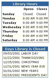 OiPac mostra página com horário da Biblioteca. Esta pode conter horário normal de funcionamento bem como dias feriados ou dias em que a Biblioteca estará fechada: